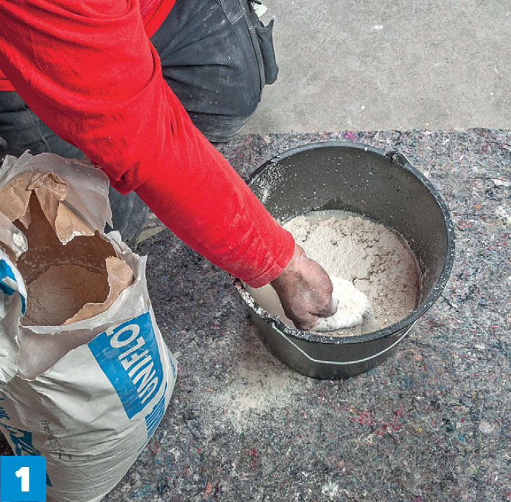 Sekoita tasoite kermavaahtomaiseksi massaksi. Tässä käytetään veteen sekoi tettavaa jauhetta, mutta voit käyttää myös valmistasoitetta.