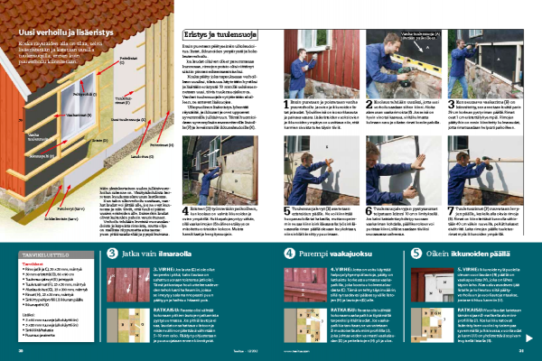 Ensin puretaan ja poistetaan vanha puuverhoilu ja ovien ja ikkunoiden listat ja laudat. Työvälineinä on iso sorkkarauta ja painava vasara. Lisäeristeiden vuoksi ovien ja ikkunoiden ympärys on uusittava niin, että karmien sivuista tulee täysin tiiviit.