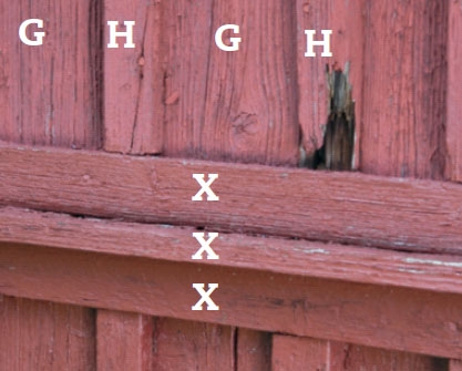 4. VIRHE: Jotta on voitu käyttää halpoja lyhyempiä lautoja, pääty on katkaistu korkeussuunnassa vaaka-palkilla, joka koostuu kolmesta lau-dasta (C). Tämä on tehty täysin väärin, sillä nyt sadevesi pääsee syvälle listo-jen (H) ja lautojen (G) alle.