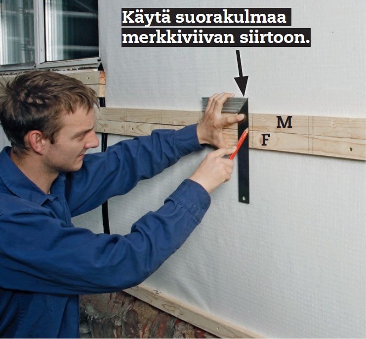 Tuuletusrimoihin (F) tehdään merk-kiviivat lautoja (G) varten: yksi ylä- ja yksi alarimaan. Työ sujuu nopeasti, kun viiva vedetään mittalistaan (M) tehdyn, lautaa ja 1-1,5 cm leveää rakoa vastaavan merkinnän avulla. Viivat siirretään tuuletusrimaan.