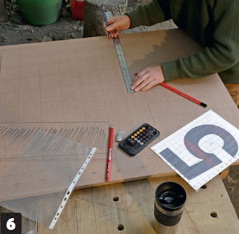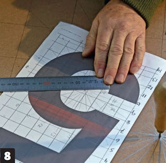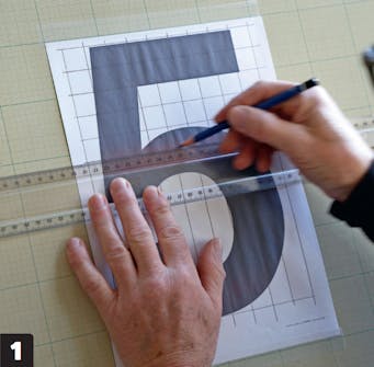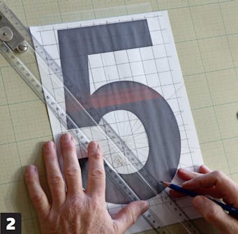 Piirrä luvun päälle kaksisenttinen ruudukko. Tämä vitonen on noin 25 senttiä korkea, ja siitä on tarkoitus tehdä metrin korkuinen, joten numero suurennetaan nelinkertaiseksi.