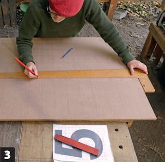 Piirrä vastaava ruudukko MDF-levylle. Tästä ruudukosta tulee neljä kertaa isompi, joten ruuduista tehdään 8x8 sentin kokoiset. Levy toimii myöhemmin sapluunana.