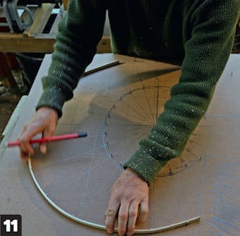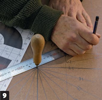 Numeroi kaikki kompassiruusun viivat, mittaa etäisyys keskikohdasta kaaren sisäreunaan ja merkitse etäisyys MDF-levylle. Tässä linjan 21 sisämitta on 4 senttiä.