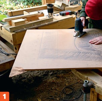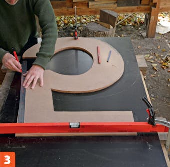 Kiinnitä sapluuna 18 millin muottivaneriin. Jos sapluuna on jostain kohdasta väärän muotoinen, asian voi korjata tässä vaiheessa piirtämällä linjat oikein.