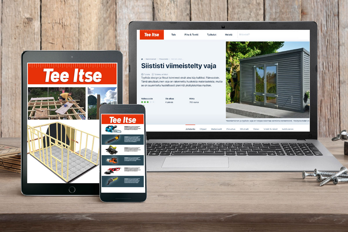 Tee Itsen digitilaukseen kuuluu rajoittamaton lukuoikeus yli 1000 rakennusohjeeseen, yli 60 työkalutestiin ja paljon muuta.