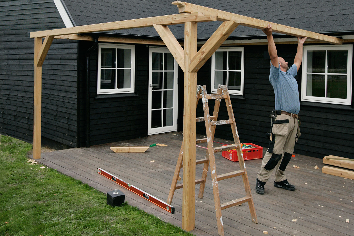 Kuinka katettu terassi rakennetaan? Vastauksen löydät tältä sivulta: olemme keränneet runsaasti ohjeita, joiden avulla rakennetaan puinen, katettu terassi. Valitsetpa minkä tahansa puurakenteen, saat selkeät vaiheittaiset ohjeet, joilla sahaat tolpat, ruoteet ja tukirakenteet oikeisiin mittoihinsa sekä kokoat kehikon – ja kuinka asennat itse katteen siten, että se kestää sadetta, lunta ja tuulta sekä viettää oikeassa kulmassa poispäin talosta. Seuraa täältä löytyviä rakennusohjeita. Näin varmistat, että rakentamasi katettu terassi on tukeva ja kestävä.