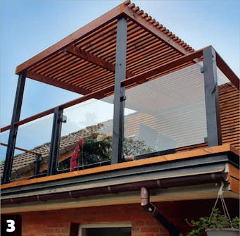 Lasikaiteet (D) ovat kalliita, mutta niiden asentaminen sujuu nopeasti. Kaksi kiinnikettä tolppaa kohti riittää. Lasi painetaan kumireunaisten kiinnikkeiden väliin.