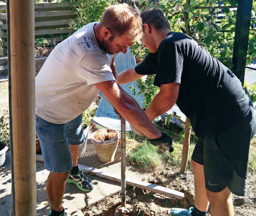 Tee kuopat tolpille (A), kun olet mitannut niiden paikat. Kuopat on helpointa tehdä maa kairalla työkaverin kanssa. Tee rei’istä niin syvät, että ne yltävät roudattomaan maahan asti. Tee kuopista niin isot, että tolpille on kunnolla tilaa.
