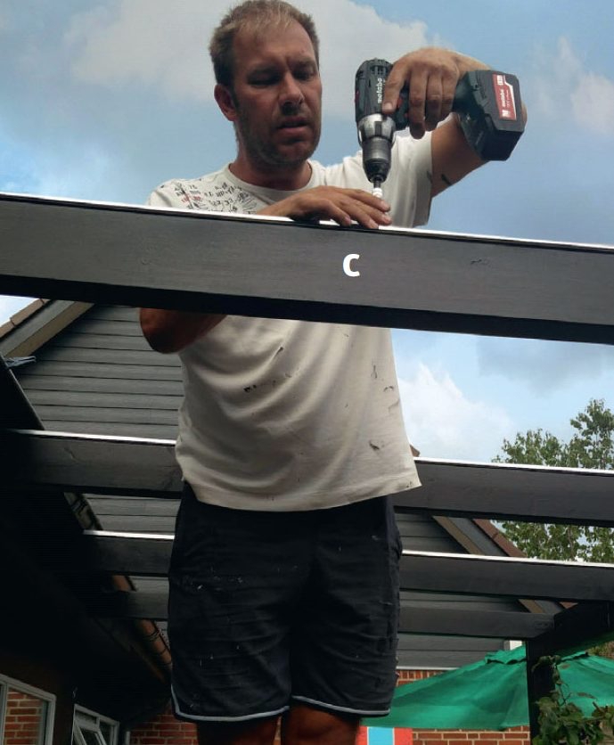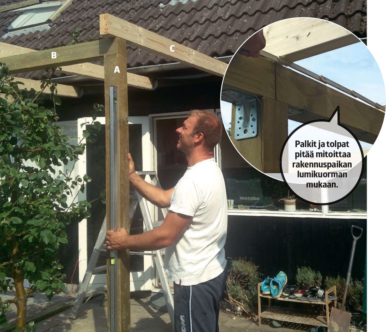 Kiinnitä lapepalkki (C) talon otsalaudassa olevaan palkkikenkään. Kiinnitä palkki tässä vaiheessa 5x40 millin ruuveilla. Varmista, että otsalauta on lujasti kiinni talon katossa, jotta katoksen päälle satava lumi ei paina katosta irti talosta talven aikana.