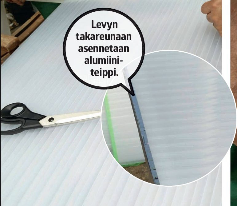 Valokatelevyn etureunaan asennetaan sellotape-erikoisteippi ja takareunaan alumiiniteippi. Levyjen pitää olla sentin lapepalkkeja pitemmät. Levyjen suojateipit pitää irrottaa ennen teippien liimaamista.