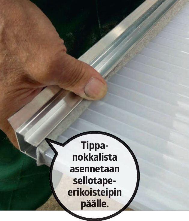 Tippanokkalista kiinnitetään erikoisteipin päälle silikonilla. Muista asentaa levyn oikea puoli ylöspäin.