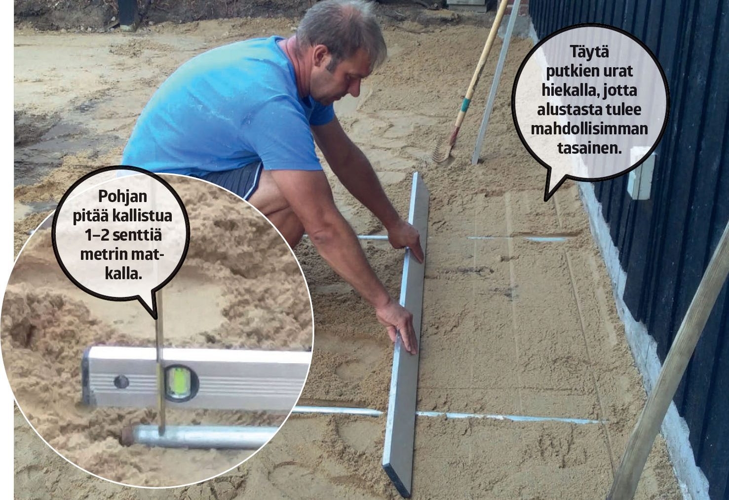 Levitä murskeen päälle asennushiekkaa ja tasoita se. Asennushiekkakerroksen pitää olla 3-5 senttiä paksu. Voit tasoittaa hiekan esimerkiksi kahden putken avulla. Upota putket hiekkaan ja vedä hiekan pinta tasaiseksi putkia pitkin esimerkiksi suoralla laudalla. Kun olet tasoittanut koko pohjan, voit asentaa laatat. Tässä vanhat laatat päätettiin asentaa takaisin.