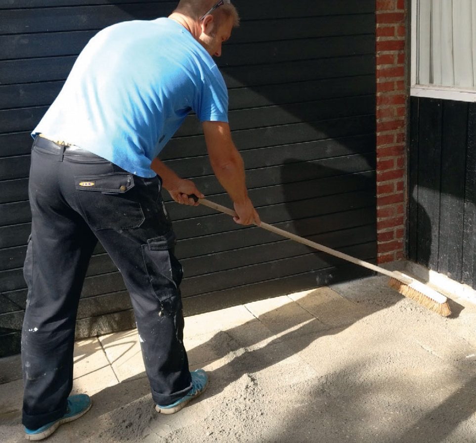 Tiivistä murske perusteellisesti tärylevyllä eli lätkällä, jotta uusi laatoitus ei vajoa. Aja lätkällä pari kertaa ristiin rastiin kiveyksen poikki.