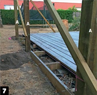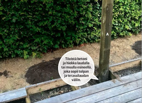 Tee maakairalla noin 90 senttiä syvät kuopat tolppien kohdalle. Harkitse terassin runkolankkujen katkaisemista, jos ne ovat tolppien tiellä. Tue runkolankut, ennen kuin sahaat ne poikki.
