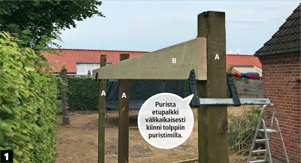 Purista etupalkki (B) kiinni tolppiin kutakuinkin oikeaan korkeuteen. Palkin korkeutta on helppo hienosäätää myöhemmin puristinten avulla.