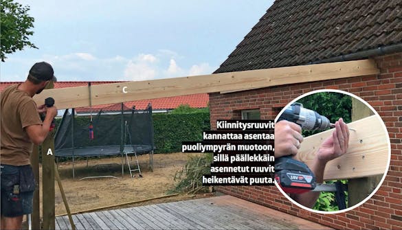 Ruuvaa palkit (C) kiinni tolppiin (A) neljällä 5,0x100 millin ruuvilla. Muista, että katoksen pitää kallistua ulospäin vähintään sen verran kuin valo katevalmistaja suosittelee.
