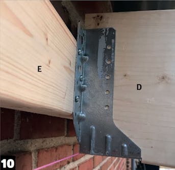 Sahaa palkkien (D) päät viistoiksi ja tee alapuolelle palkkikenkiin sopivat lovet. Sahaa myös palkin alapää viistoksi, jotta se yhdistyy siististi etupalkkiin (B).