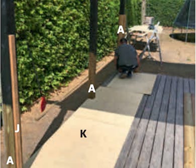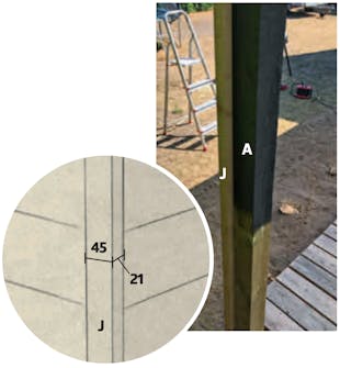 Asenna nurkkarimat (J) tolppiin (A). Tee rimoista yhtä korkeat kuin laudoituksesta, jotta vuorilautojen päät peittyvät siististi alhaalta ylös asti. Tee alussa irrotettuihin terassilautoihin kolot, jotta laudat sopivat tolppien ympä-rille. Asenna terasilaudat takaisin 45 paikoilleen.