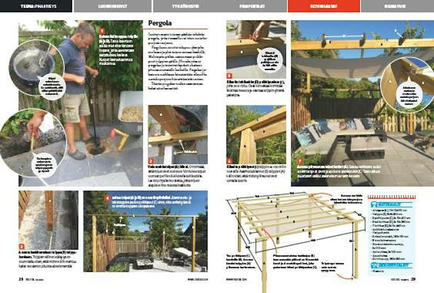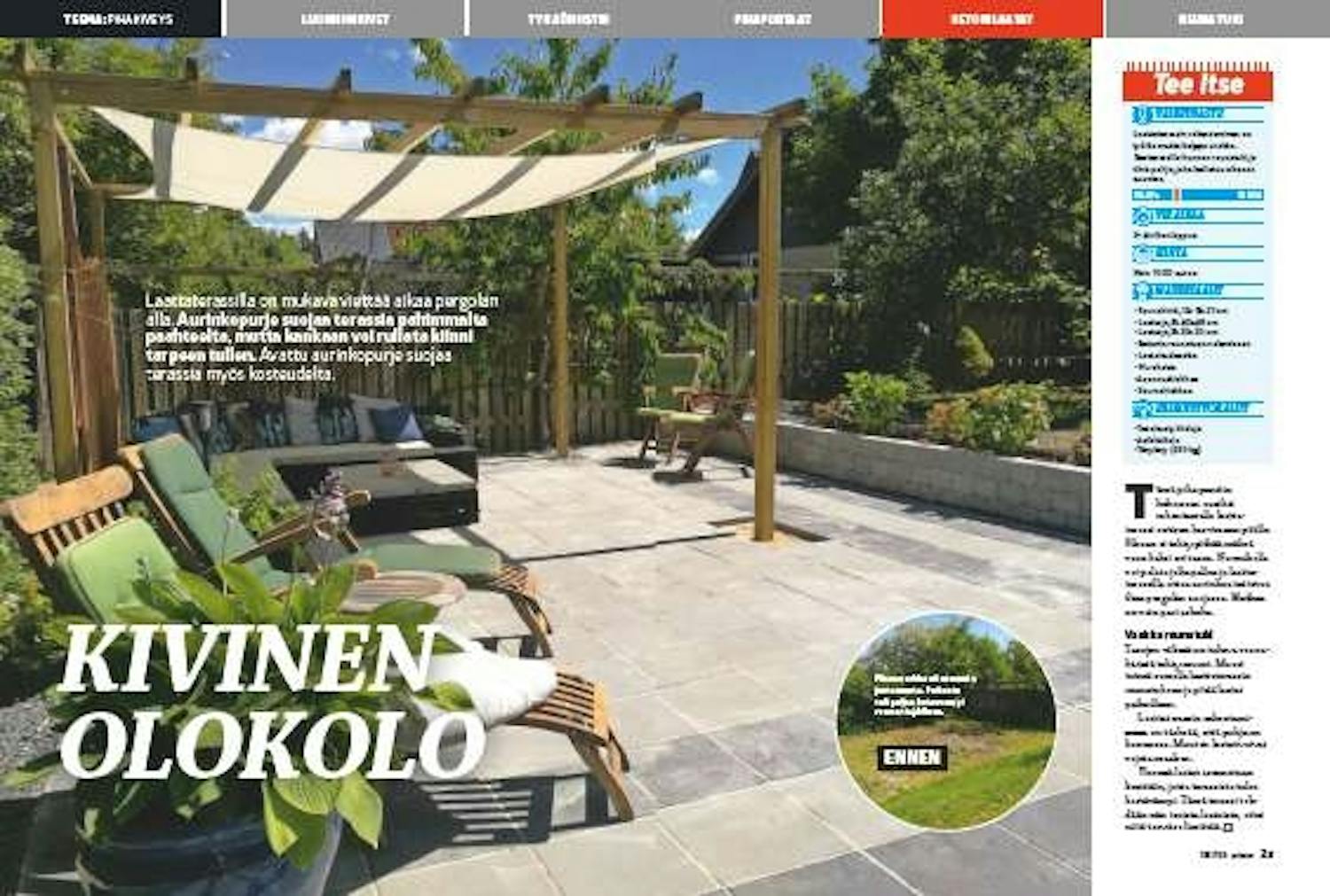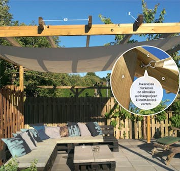 Laattaterassin toiseen päähän tehdään pergola, jotta terassilla voi istua aurinko purjeen varjossa.