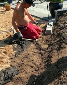 Viritä linjalanka kiveyksen reunaan. Asenna reunimmaiset kivet tarkasti suoraan linjaan langan mukaan.