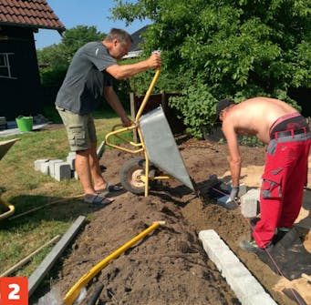 Muuri erottaa terassin nurmikosta. Muuri tehdään reunakivistä, jotka asennetaan kouruun linjalangan avulla.