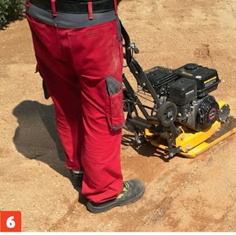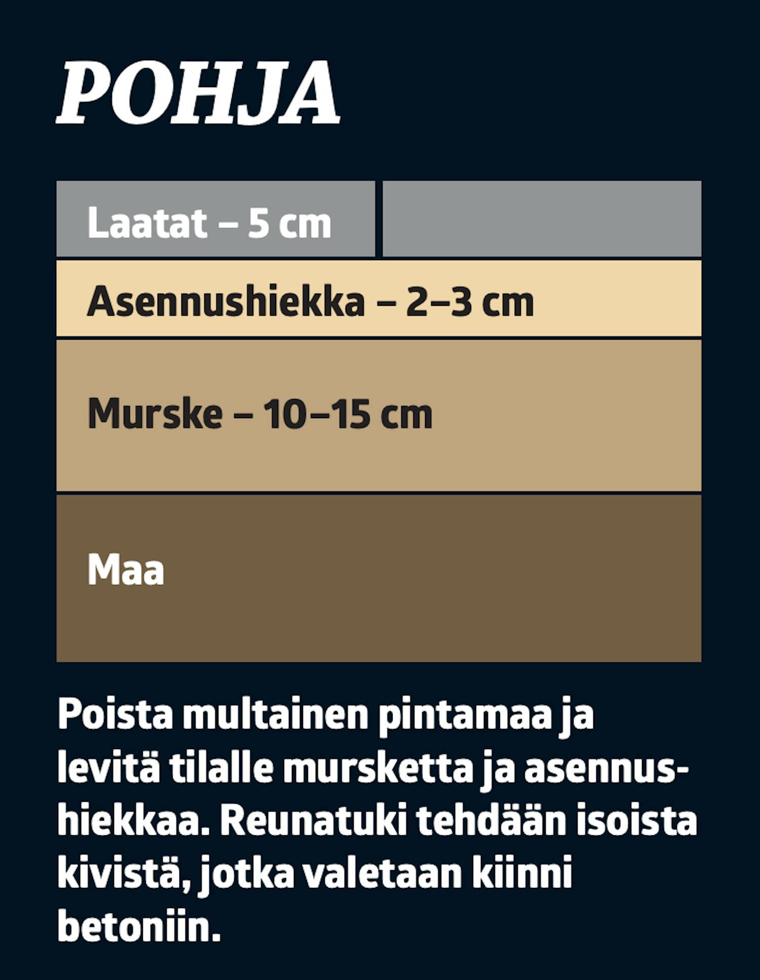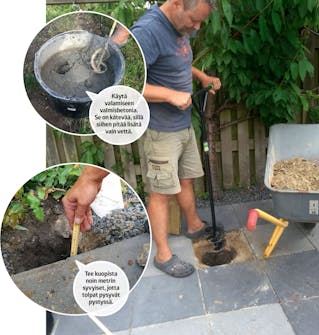 Levitä terassin kohdalle 15 sentin kerros mursketta ja tiivistä se tärylevyllä. Tee maahan 1-2 sentin kallistus metriä kohti, jotta vesi valuu pois terassilta.