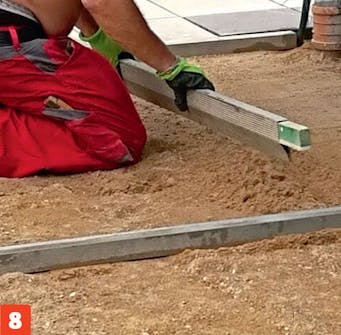Tasoita asennushiekka tarkasti. Upota hiekkaan kaksi putkea sopivaan syvyyteen ja vedä hiekan pinta tasaiseksi putkia pitkin.