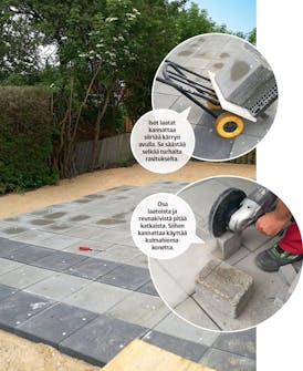Levitä murskeen päälle 2-3 sentin kerros asennushiekkaa. Näin isolla alueella kannattaa käyttää asfalttikolaa.