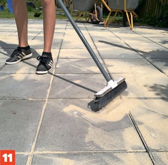 Liimaa seuraavat kivet kiinni laatoitus laastilla. Levitä laastia kauhalla ja asenna seuraavan rivin kivet limittäin. Pese liika laasti huolellisesti pois vedellä.