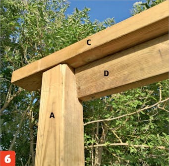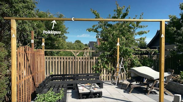 Pergolassa on viisi tolppaa: yksi joka nurkassa ja yksi toisen reunan keskellä. Molempiin päihin asennetaan poikki puut tolppien päälle. Ne vakauttavat pergolan ja toimivat hyvänä alustana pituussuuntaisille lankuille. Pergolan jo kaiseen nurkkaan kiinnitetään silmukka aurinkopurjeen kiinnittämistä varten.