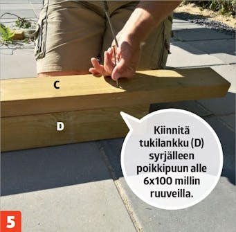 Kiinnitä poikkipuut (C) tolppiin 6x100 millin ruuveilla. Asenna tukilankut (D) tolppien (A) väliin siten, että niiden yläreunat ovat samalla tasolla.