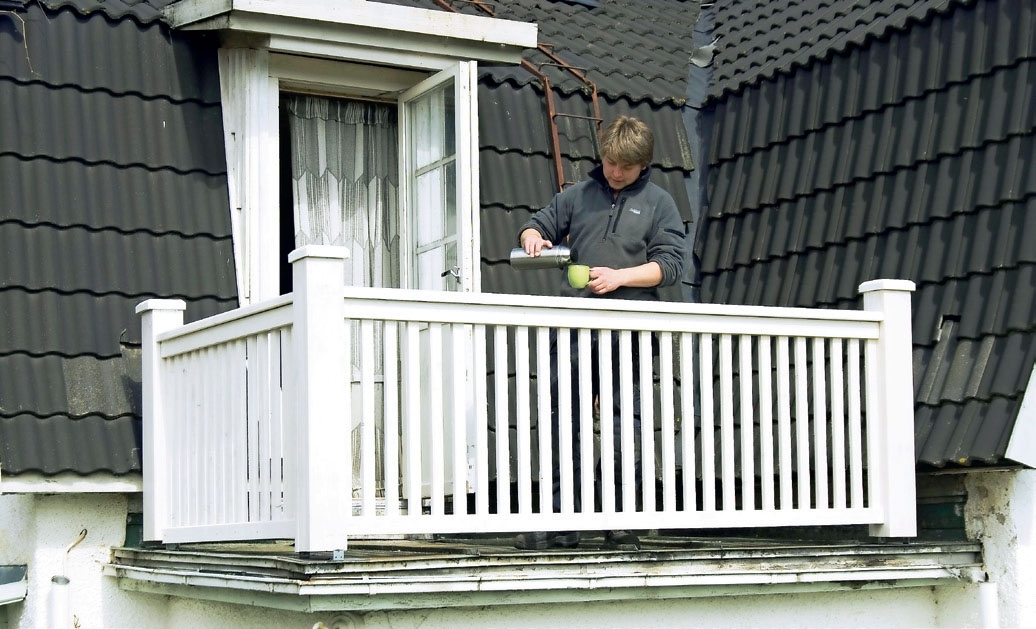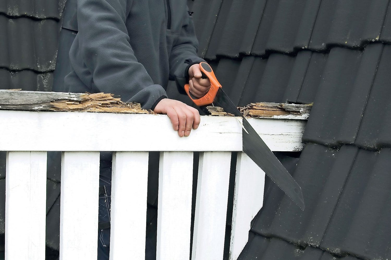 Vanhojen kaiteiden korkeus tuntui sopivalta, joten sekä korkeus että pituus mitattiin ennen kuin kaiteet sahattiin pieniksi kappaleiksi ja poistettiin. Kaide oli alunperin kiinnitetty kattotiilien läpi talon kannatinpalkkeihin.