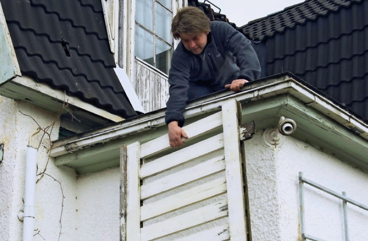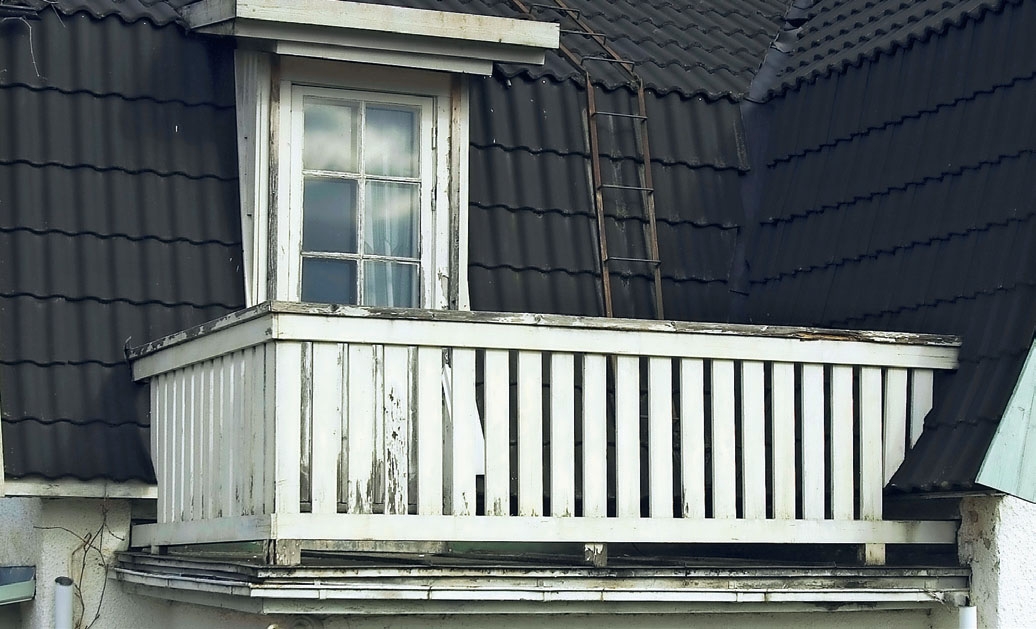 Tämä on huono ratkaisu, joten paikkaamme katossa olevat reiät uusilla tiilillä. Ala-kerran kuistin katto toimii parvekkeen alustana. Katto puhdistetaan ja tiiviste-tään, jotta uudet tolpat voidaan asentaa.
