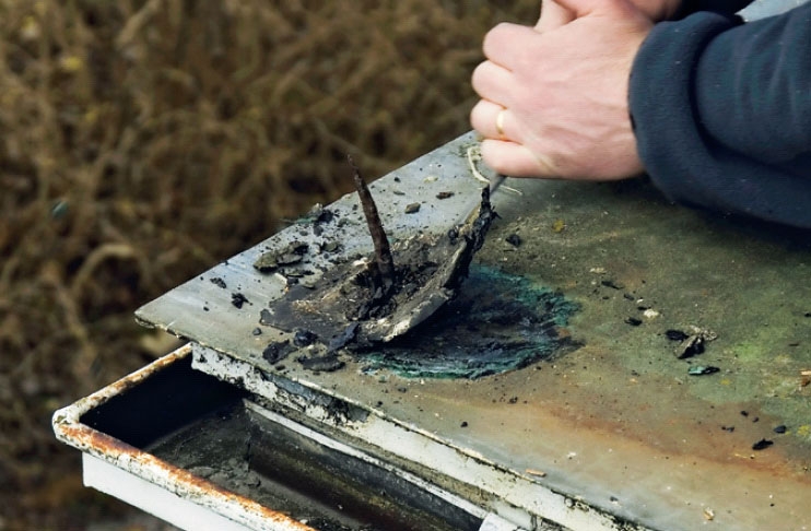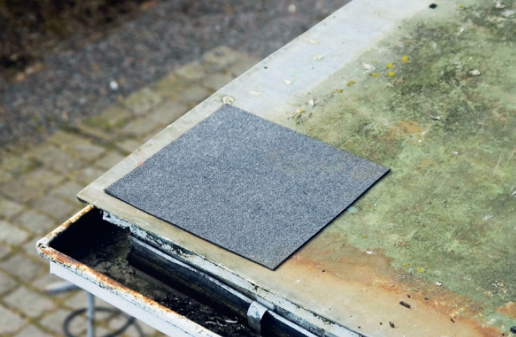 Leikkaa pala bitumihuopaa ja sijoita se niin, että se peittää vanhan kaiteen korjauskohdan. Merkitse palan paikka lyijykynällä ja nosta pala vielä pois.