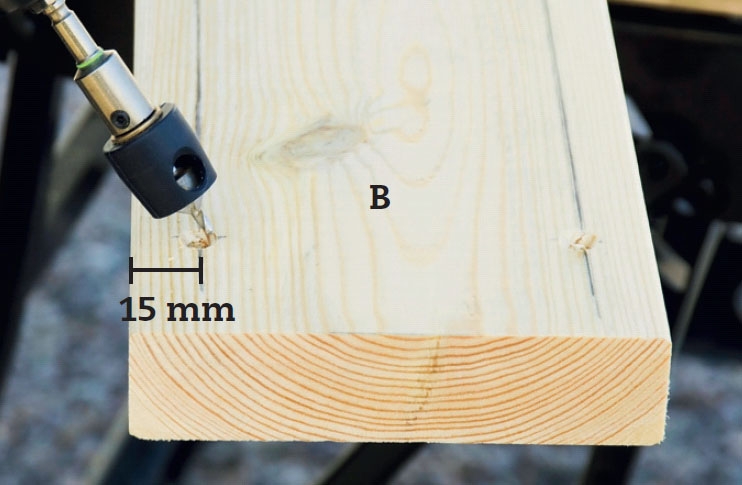 Kahteen leveään lautaan (B) mer-kitään ruuvien paikat. Jokaiseen tolppaan tulee viisi ruuvia kaikille pitkille sivuille. Sijoita ruuvit 15 mm:n päähän reunas-ta. Esiporaa 6 mm poralla ja upota kannat.