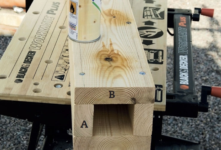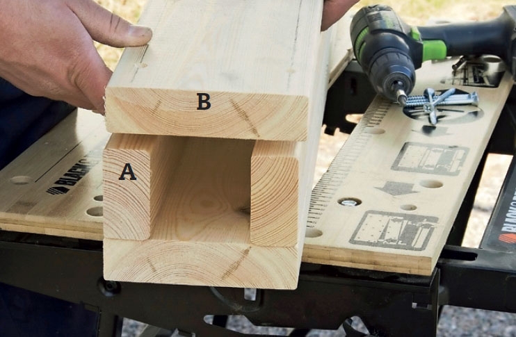 Laudat (A ja B) sahataan mittaan. Tässä käytetään 33 mm paksuja lautoja, sillä ne vakauttavat rakennetta paremmin kuin tavalliset 21 tai 28 mm paksut laudat.