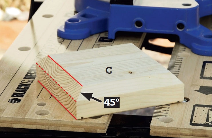 Jokainen tolppa suljetaan päältä "hatulla" (C). Sitä varten 45 x 170 mm soirosta sahataan 170 x 170 mm neliöitä, joiden yläreunat viistetään.