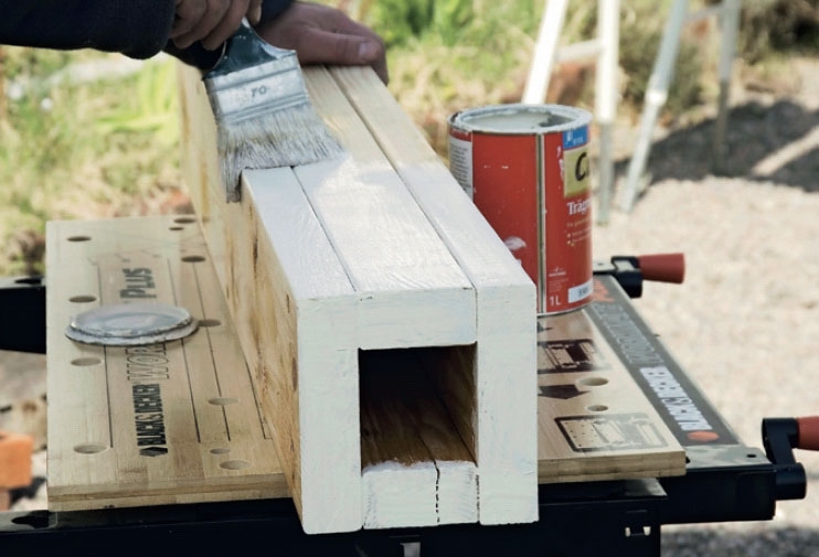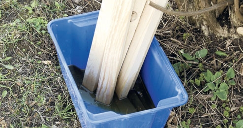 Ennen kuin kaiteet pohjustetaan ja maa-lataan, ne käsitellään oksalakalla. Oksakoh-dat pitäisi käsitellä vähintään kahteen ker-taan, ja lakatun kohdan pitää kuivua kunnolla ennen toista käsittelyä. Nämä tolpat päätet-tiin pintakäsitellä vasta, kun ne on koottu. Käsittely olisi kuitenkin paras tehdä ennen kokoamista, jotta puu kestää pidempään.