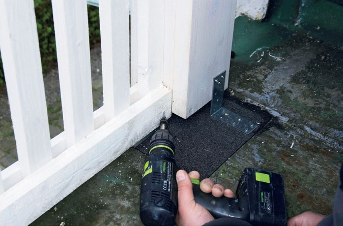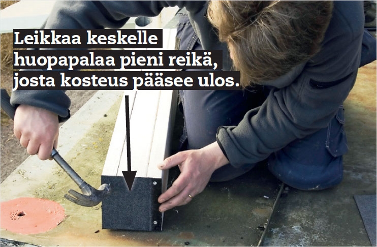 Kattopinta on nyt puhdas ja siisti tolp-pien asennusta varten. Jokaisen tolpan alle laitetaan bitumihuopakaistale, jotta kosteus ei pääse imeytymään puun pää-typintaan. Myös katolle asennetaan bitu-mihuopapala, jolla sinetöidään vanhan kaiteen jättämät reiät. Bitumin sijaan voi käyttää aluskermiä.