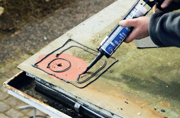 Tiivistä alue tiivistemassalla. Purista massaa yhtenäisenä vanana koko paikka-alueen reunojen ja reikäkoh-dan ympärille. Paina huopapala kiinni.