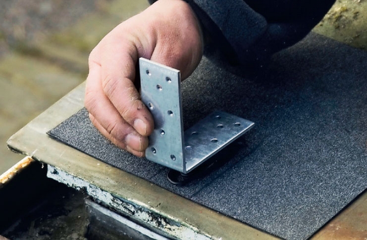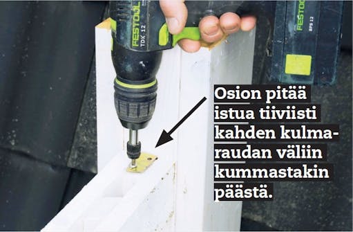 Mittaa ja sijoita kulmarauta. Kulmarauta asetetaan tiivistemassan päälle ja kiinnitetään naulauslevyruuveilla.