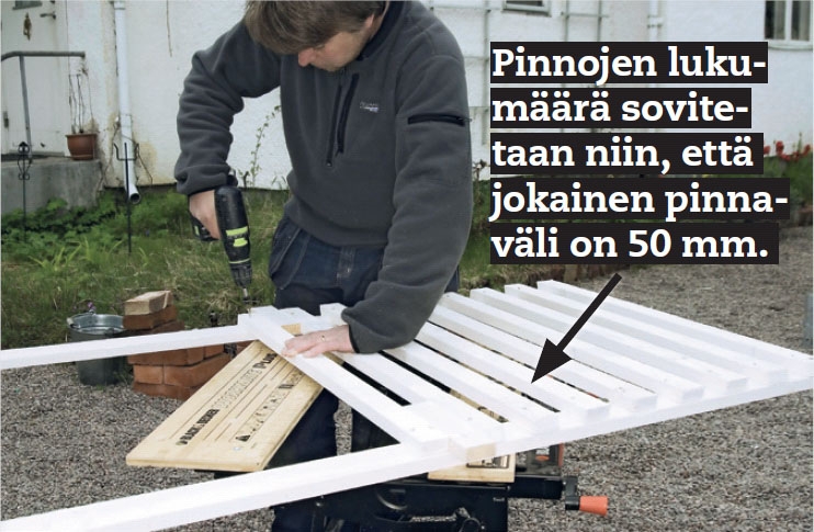 Kun pinnojen toisen puolen vaakalaudat on kiinnitetty, osio on valmis, ja se voidaan asentaa kahden tolpan väliin. Tarkista, että osio sopii paikalleen.