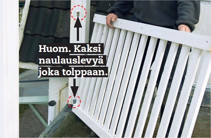 Alhaalla ei ole tilaa ruuvata osiota kiinni kulmarautaan. Tämän vuoksi vaakalaudat kiinnitetään kahdella viistoon kiinnitettävällä ruuvilla tolppaan, yksi ruuvi kummaltakin puolelta.