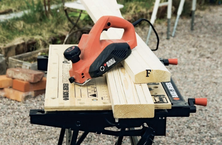 Käsijohteet (F) höylätään pinnalta kaareviksi. Piirrä apuviivat laudan pituussuunnassa höyläystä varten. Hio pinta lopuksi täysin tasaiseksi ja sileäksi.