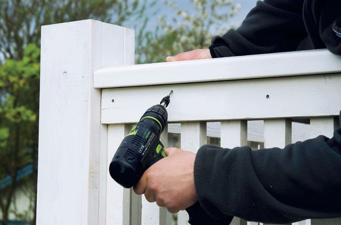 Kiinnitä kaikki pinnat kahdella ruuvilla jokaisesta liitoksesta. Käytämme 4,2 x 41 mm ruuveja. Säilytä sama pinnaväli koko kaiteen pituudelta.