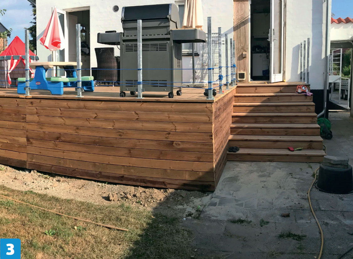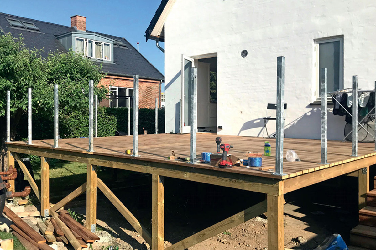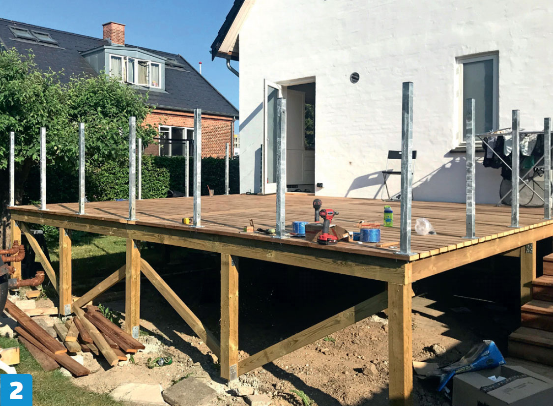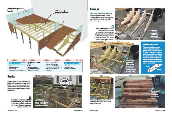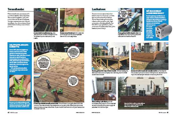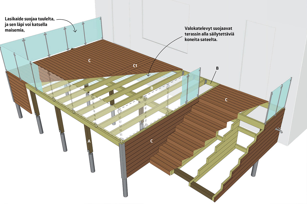 Tolppien ja lasikaiteiden asenta-misessa pitää olla tarkkana, mutta terassilautojen asentaminen sujuu nopeasti.