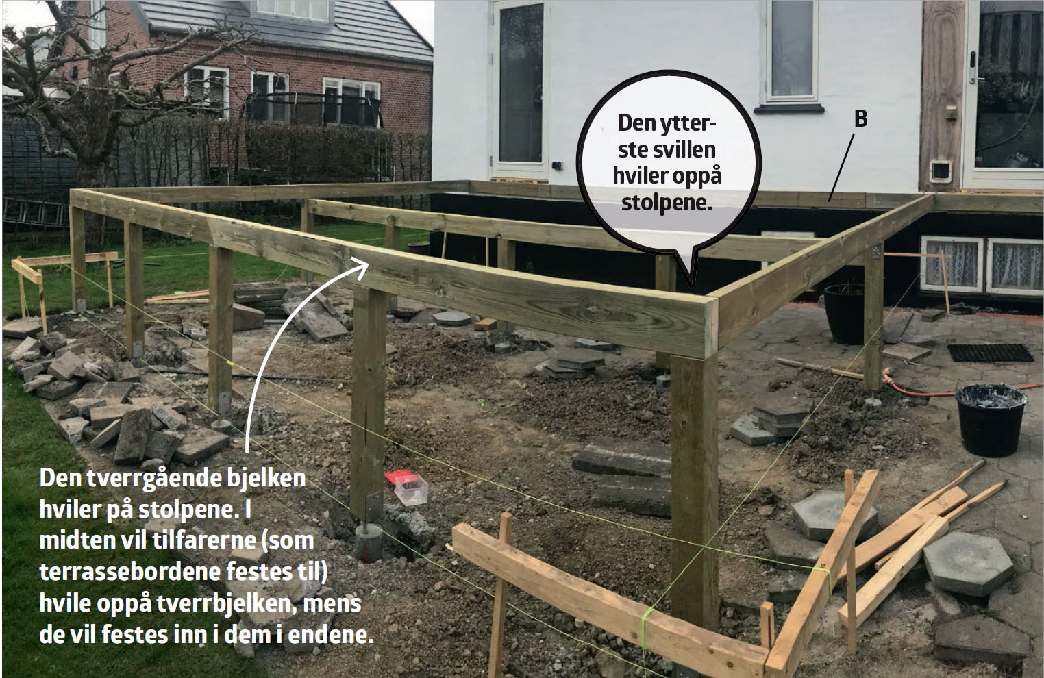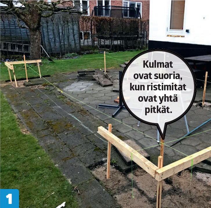 Tee neljä puukehikkoa ja viritä niiden välille linjalangat terassin reunojen kohdalle. Tarkista terassin ristimitat kelamitalla ja siirrä lankoja, kunnes mitat täsmäävät millilleen.