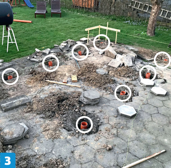 Upota kuoppiin muoviputket siten, että niiden pinta jää pari senttiä maan pinnan yläpuolelle. Sekoita seuraavaksi betoni.