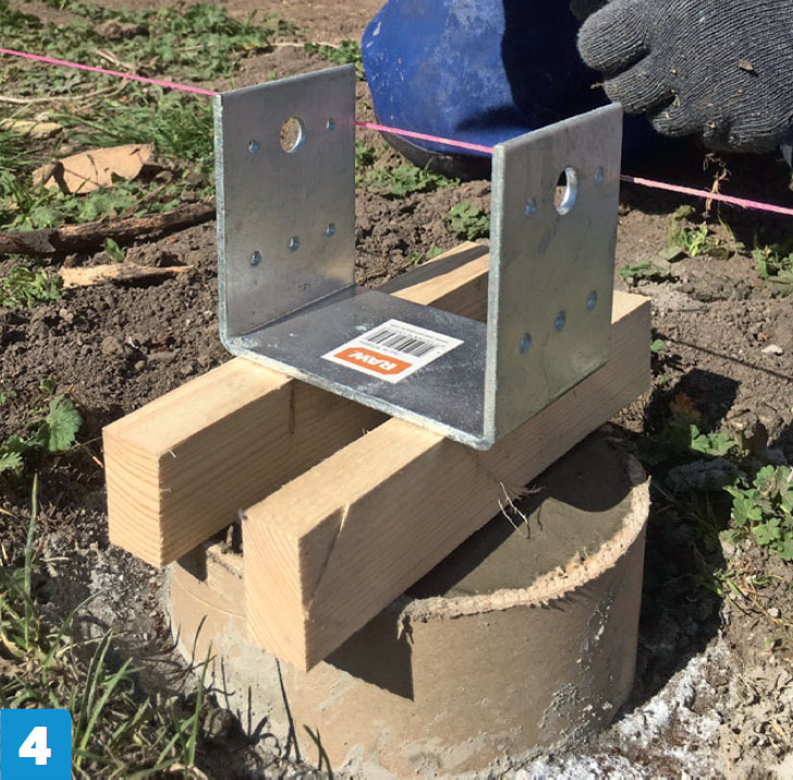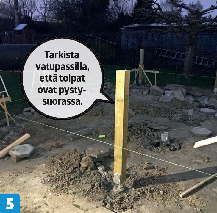 Kaada betoni putkiin ja tue tolppakengät parilla kapulalla. Muuten tolppakengät vajoavat, ennen kuin betoni kovettuu. Voit asentaa tolpat vuorokauden kuluttua.