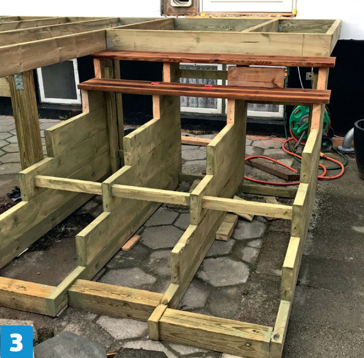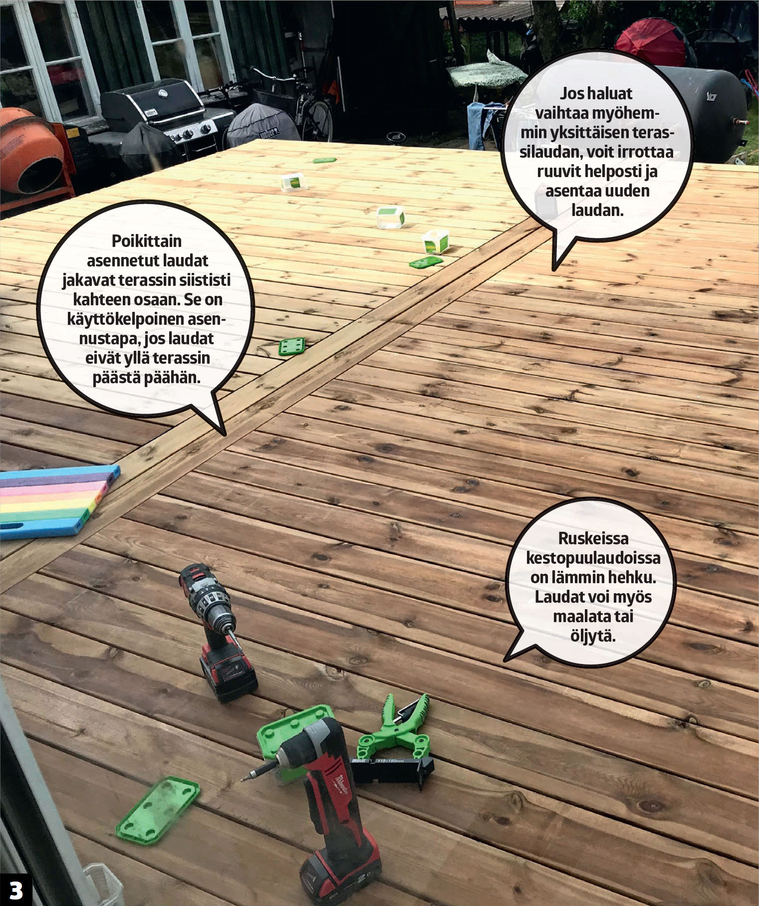 Sahaa terassilaudat ja ruuvaa ne kiinni samalla tavalla kuin muut terassilaudat (katso seuraava osio).